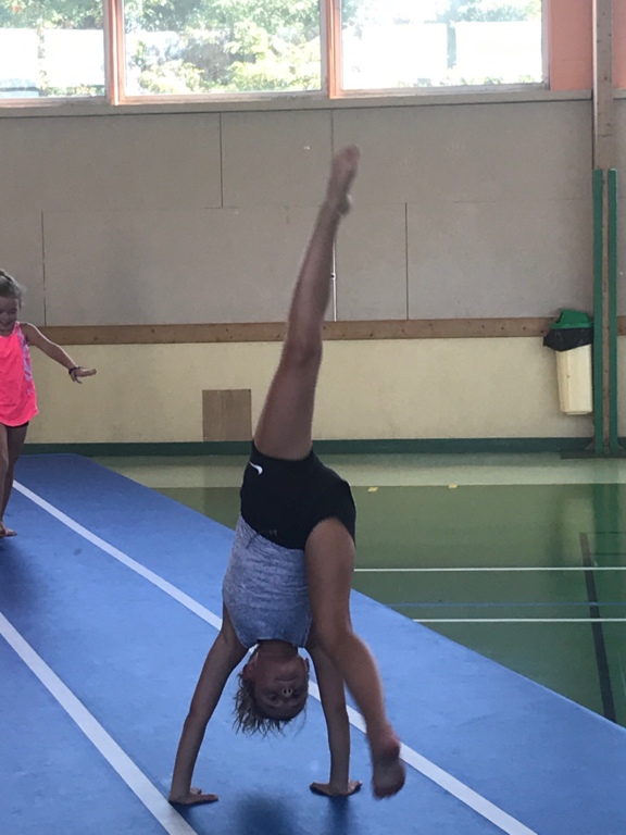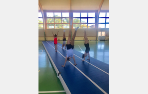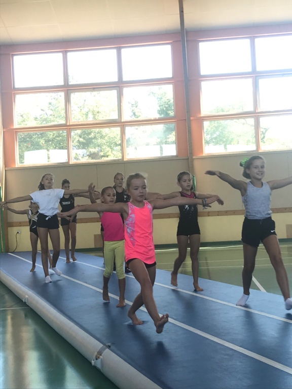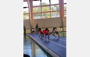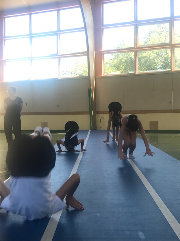 Échauffement et démonstrations de gymnastique au sol.